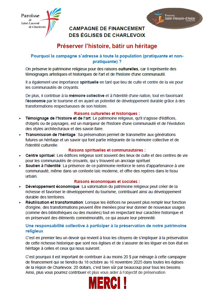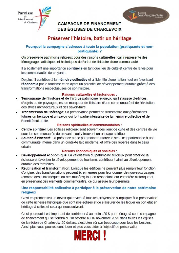 Campagne de financement pour la conservation de notre patrimoine religieux dans notre unité pastorale. Posté le : 29 septembre 2025