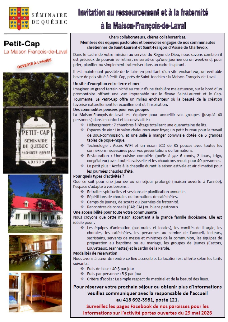 Un site enchanteur pour pouvoir se retirer pour des activités de groupe : la Maison François de Laval située à Petit Cap, près de Saint-Joachim. Posté le : 1 mars 2026